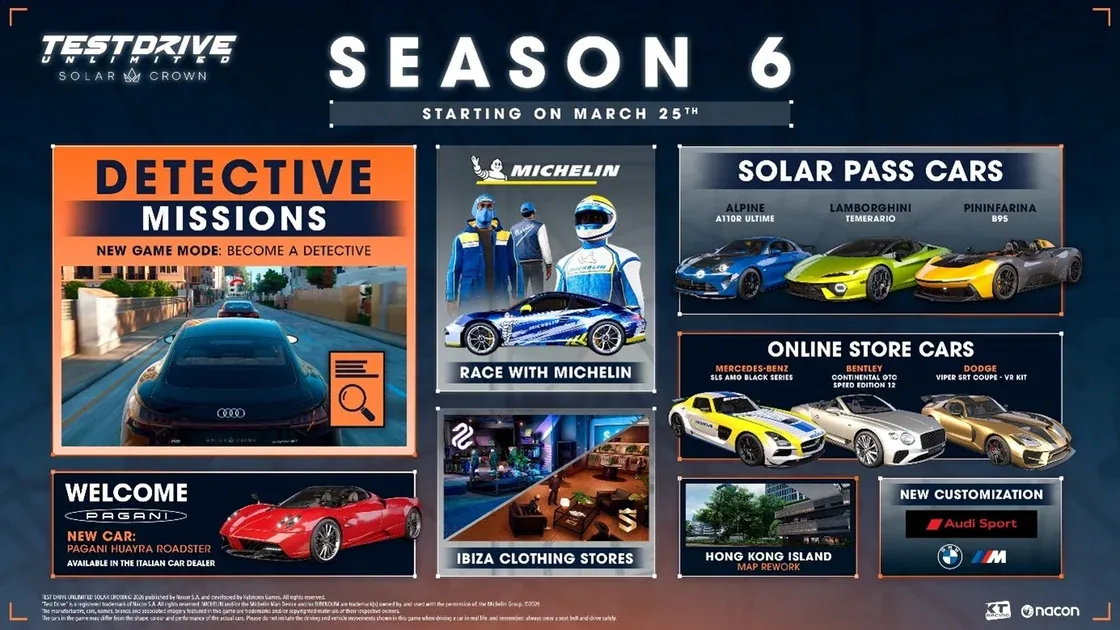 KT Racing y Nacon anuncian el lanzamiento de la Temporada 6 de Test Drive Unlimited Solar Crown. Esta actualización gratuita, disponible para todos los jugadores, añade nuevo contenido como misiones de Detective, tiendas de ropa en Ibiza, una topografía renovada de la Isla de Hong Kong, nuevos vehículos, una colaboración con Michelin, así como numerosas mejoras técnicas y de red.