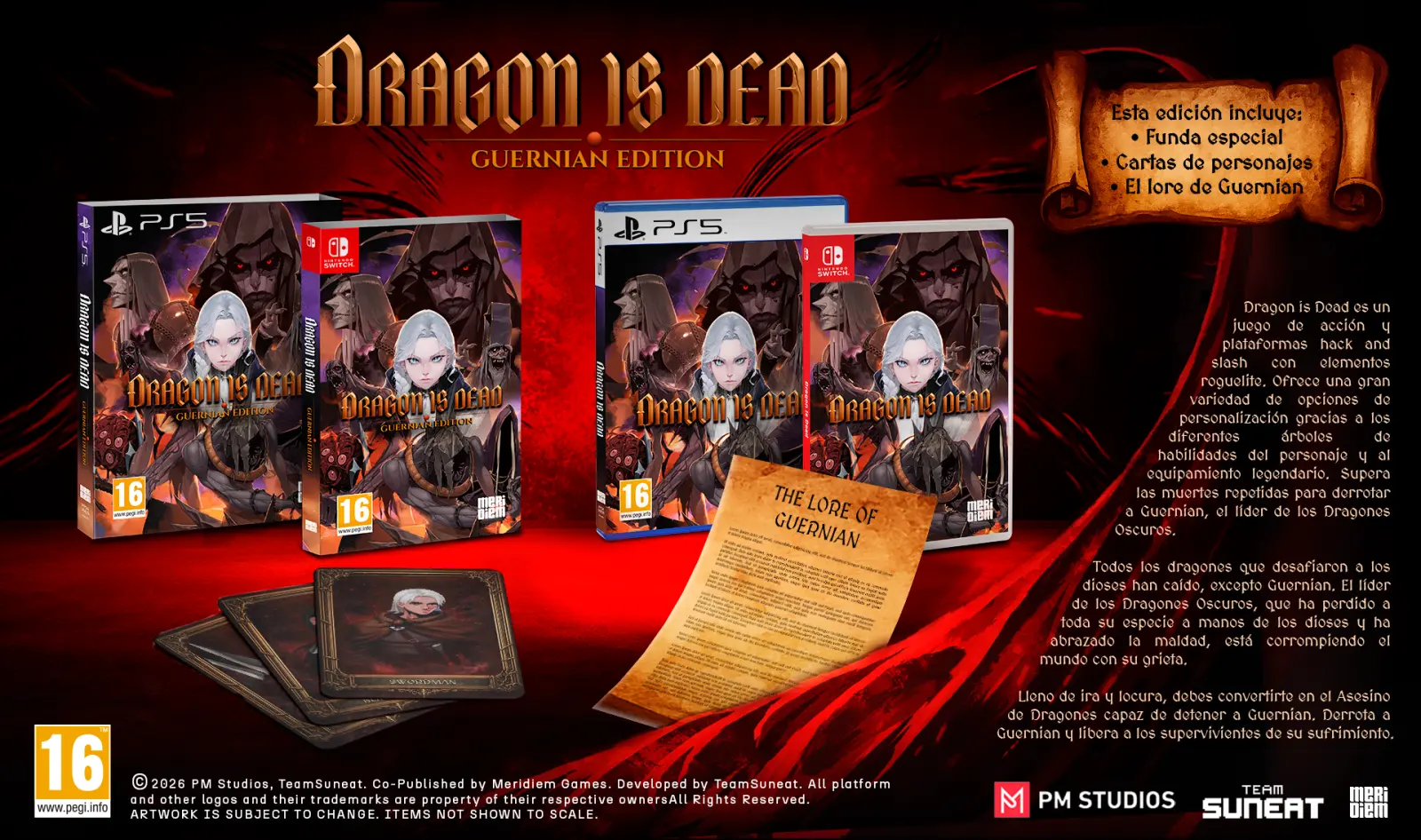 Meridiem ha sido responsable del diseño y la fabricación de esta edición física, que estará disponible en tiendas especializadas. La edición física Guernian Edition de Dragon is Dead para PlayStation 5 y Nintendo Switch, incluye, además del videojuego, una funda especial, cartas de personajes y el Lore de Guernian. Desafía a la muerte. Acumula poder. Masacra dioses.En este roguelite de acción y fantasía oscura, la muerte es solo el principio. Como un Sucesor inmortal, ábrete paso por tierras corrompidas, domina tres clases distintas y conserva tu equipo legendario para regresar más fuerte tras cada caída. El Amanecer Negro te espera.